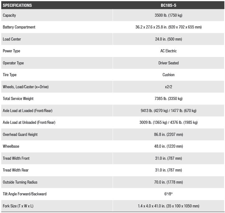 Forklift Bobcat BC18S-5 termasuk dalam segmen electric counterbalance dengan ban karet (cushion tire), yang cocok untuk permukaan halus seperti lantai gudang.