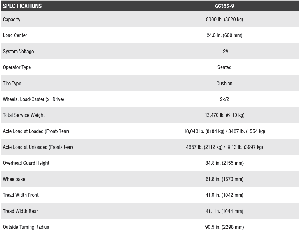 Bobcat GC35S-9 termasuk dalam jajaran Large-Capacity LPG Cushion Tire Forklifts dari Bobcat / Doosan, yang dirancang untuk beban besar di lingkungan indoor dengan lantai halus.