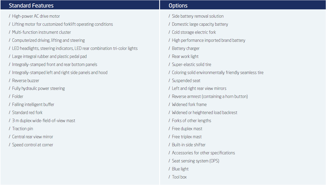 Hangcha A series 2.0-3.5t adalah salah satu model forklift bertenaga listrik dengan baterai lithium-ion yang dirancang untuk operasi penanganan material kelas menengah di gudang, pabrik, dan pusat distribusi. Seri ini menggabungkan performa kuat, efisiensi energi tinggi, serta desain yang memperhatikan kenyamanan dan keselamatan operator.