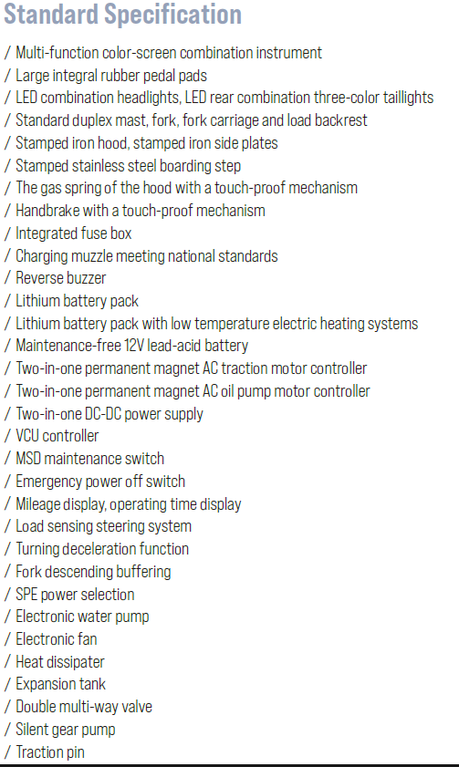 Hangcha XH Series 5.0t merupakan forklift listrik berat dengan teknologi baterai tegangan tinggi yang dirancang untuk aplikasi industri intensif. Menargetkan kebutuhan pengangkutan material di sektor seperti pelabuhan, pabrik berat, baja, dan pergudangan besar, seri ini menawarkan kombinasi performa, efisiensi, dan ketahanan tinggi yang mampu menggantikan forklift internal combustion tradisional dengan keunggulan energi listrik.