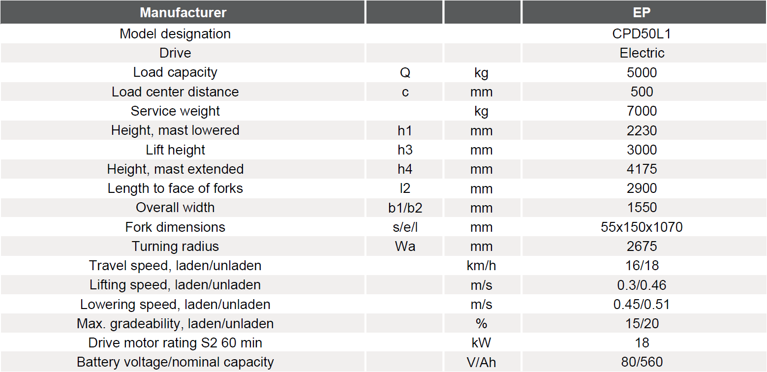 iMOW CPD50L1 adalah forklift counterbalance listrik 4 roda (4-wheel) berkapasitas 5 ton dari EP Equipment, dengan teknologi baterai lithium-ion sebagai sumber energi utama.
