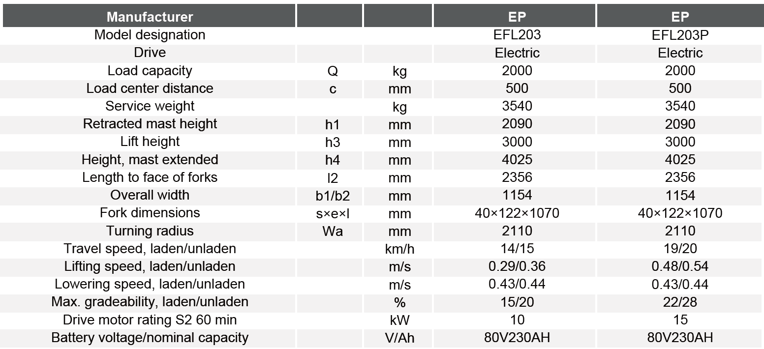 iMOW EFL203 adalah forklift counterbalance listrik seri “EFL” dari EP Equipment yang ditujukan untuk menggantikan forklift berbahan bakar di banyak aplikasi yard / outdoor ringan hingga menengah. Model ini mengombinasikan desain gaya forklift internal combustion (IC) dengan sistem tenaga listrik berbasis lithium-ion, sehingga menghasilkan tampilan robust, ground clearance tinggi, serta performa tinggi di luar ruangan dan lorong terbuka.