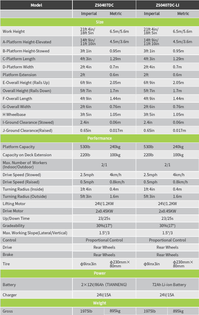 Zoomlion ZS0407DC merupakan platform Scissor Lift yang dirancang untuk aplikasi di ruang terbatas indoor maupun outdoor dengan keunggulan seperti dimensi kompak, emisi nol (karena elektrik), serta kemampuan tangga dan miring yang cukup baik.